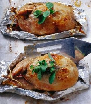 - Подавая жареную курицу или птицу к праздничному столу, на блюдо кладут фольгу, сверху — птицу, затем края фольги собирают в сборки и отворачивают их наверх, чтобы кушанье было словно охвачено фольгой. Кстати, это не только оригинальный способ подачи кушаний, но и способ сохранения их теплыми.
