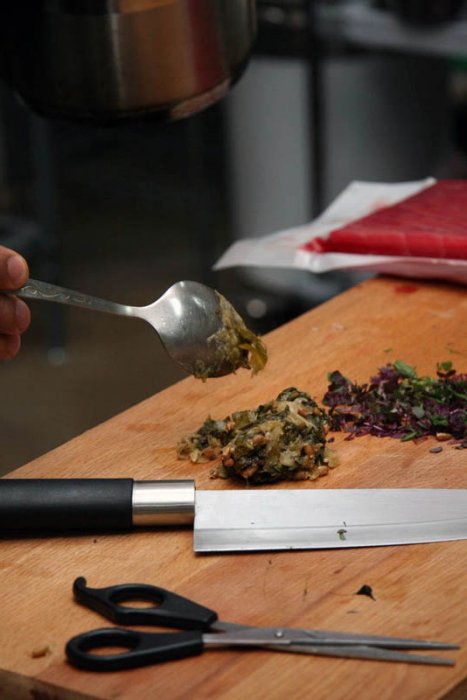 Красный тунец с листьями шизо (мел и пророщеным ячменем)