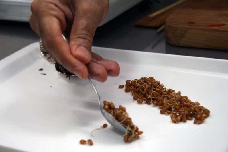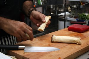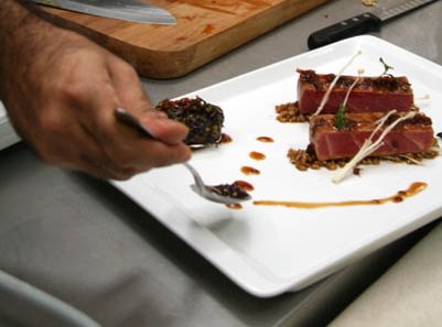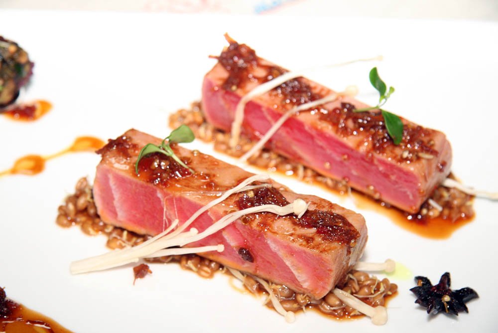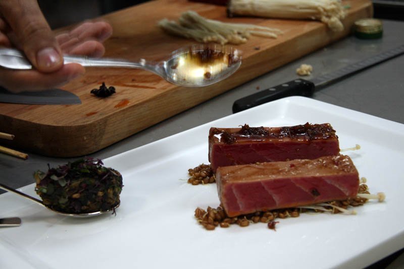 Уложить кусочки тунца на холодную тарелку. Декорировать японскими грибами и соевым соусом. Отдельно подается смесь побегов и овощей, оставшийся маринад и проросший ячмень.