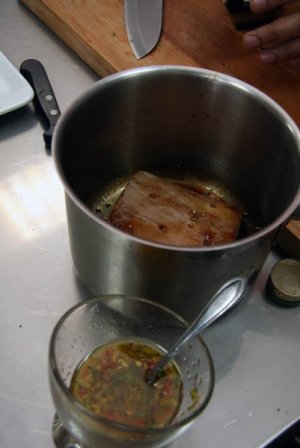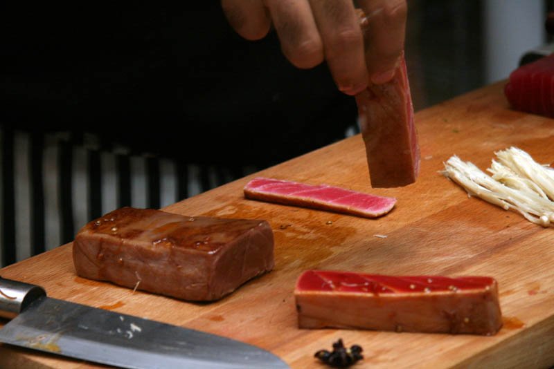 Тунца нарезать на бруски толщиной 2 см и положить в приготовленный маринад на 1 час. Поместить в холодильник.