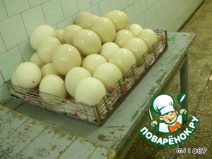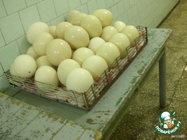Кстати, о яйцах. Их используют в пищу в вареном виде (время варки 1 час 15 минут) или готовят из них яичницу-болтунью. Одного яйца достаточно, чтобы накормить 10-12 человек, кроме того, яйца страуса входят в состав многих блюд, украшающих меню наиболее престижных ресторанов в Европе и Америке. В богемной тусовке нынче стало модно устраивать приемы со страусиными яйцами в качестве главного блюда. Известный гурман Андрей Макаревич собрал как-то близких друзей на яйцо под майонезом и с водочкой. Дешево, да сердито - и никакого холестерина