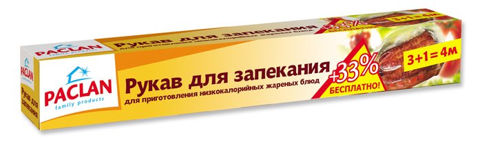 Рукав для запекания бренда Paclan представляет собой 4-метровый рулон шириной в 30 см, в приложение к которому идут специальные жаростойкие клипсы для фиксации краев рукава. Изделие производится из термостойкого прозрачного полимера, способного выдержать температуру до 230 градусов С.