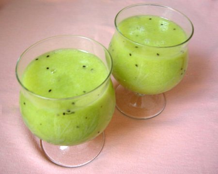 Измельчаем фрукты в блендере с добавлением охлажденного ананасового сока. Разливаем в бокалы.