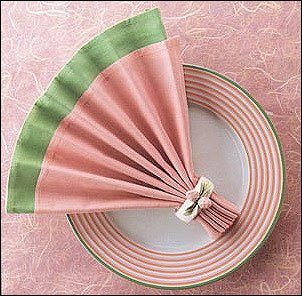 При сервировке стола к завтраку или обеду обычно салфетки складывают вчетверо, треугольником, пополам и заворачивают рулетом, что, кстати не очень трудно, а для торжественного ужина или обеда допустимы более сложные формы складывания салфеток - парусом, колпачком, свечкой и др.