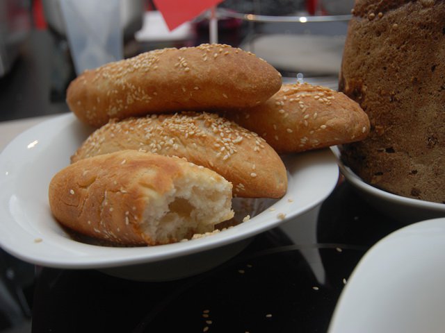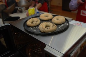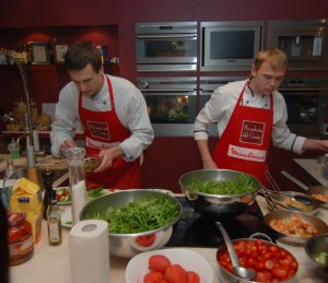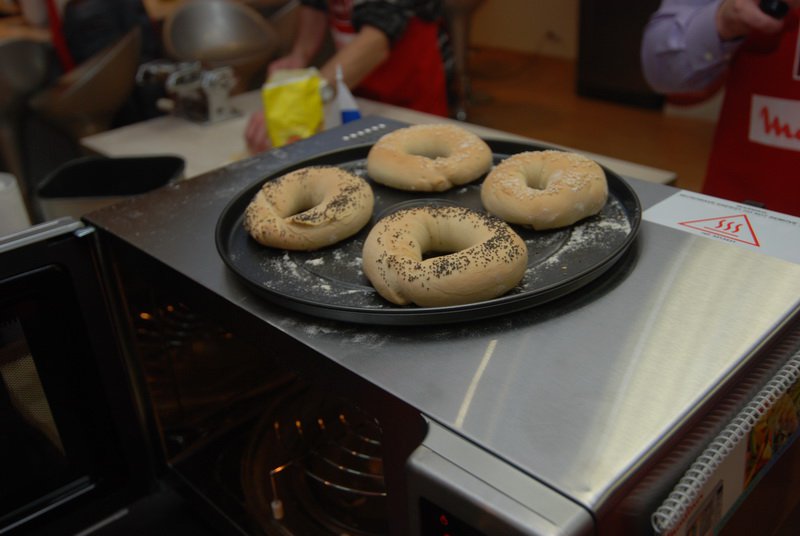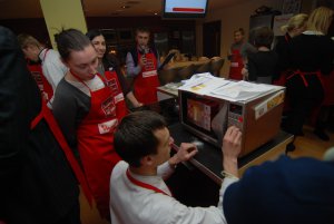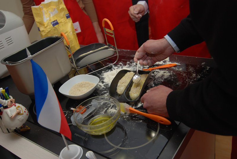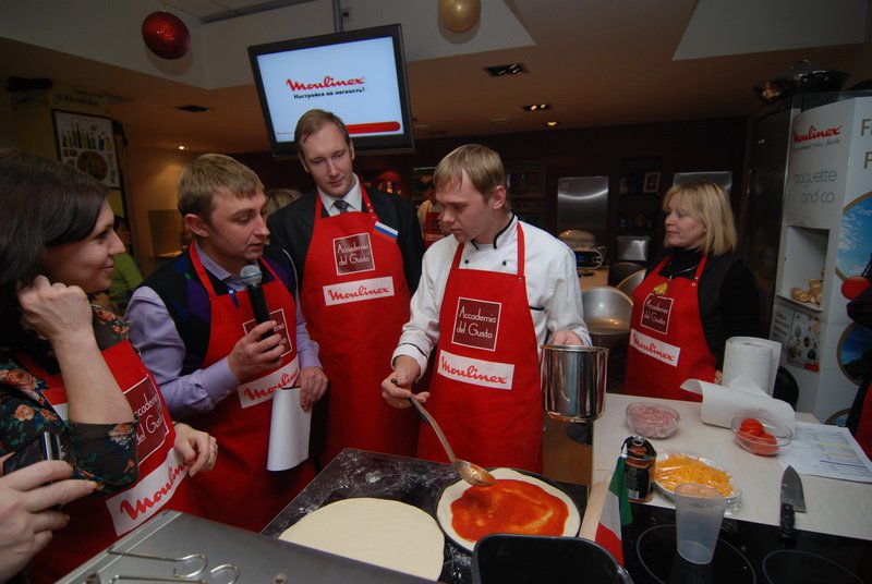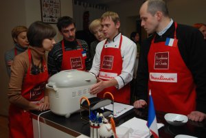 Любое занятие становится особенно захватывающим, когда оно превращается в игру. Участники мастер-класса разделились на три команды, а кому-то даже пришлось перейти под флаги других стран. Затем приступили к приготовлению выпечки, типичной для России, Франции и Италии. За отведенное время каждая команда приготовила два блюда: «русские» испекли бублики и баранки, «французы» трудились над приготовлением багета и джема, а «итальянцы» - пиццы и гриссини. Можно с уверенностью сказать, что итогом работы стали настоящие хлебные шедевры. Во-первых, рядом были харизматичные и дружелюбные повара Академии, а во-вторых – с хлебопечкой Baguette and Co от Moulinex хлеб просто не может не получиться! Ведь достаточно было выбрать одну из автоматических программ и поместить в специальную форму нужные ингредиенты, а новинка от Moulinex сама замешивала тесто и выпекала аппетитный хлеб. Участники кулинарного поединка с восторгом лепили бублики, делали пасту, раскатывали тесто для пиццы… И что могло быть потом приятнее, чем попробовать ароматный бублик с пылу с жару, испеченный собственными руками? Пожалуй, только дегустация вкуснейшей пасты, которую виртуозно приготовили повара!
