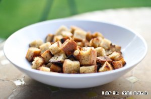 Я думаю, что почти все из нас хотя бы раз пробовали сухарики, купленные в магазине: со вкусом курицы, икры, грибов... Но в них полно всяких добавок, не всегда полезных нашему организму. Да и цена порой бывает очень завышенной. Поэтому приготовим их сами: нарезаем наш черствый хлеб на мелкие кубики, прожариваем его в сковороде с небольшим количеством растительного масла. Для большего вкуса можно заранее хлеб натереть чесночком.