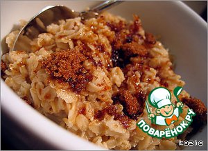 2 стакана овсяных хлопьев «Геркулес», 0,75 л воды 0,5 л молока 2 ч.ложки соли, 3 ст.ложки масла сливочного Крупу залить водой и варить на слабом огне до вываривания воды и полного загу-стения, затем в два приема долить горячим молокоми, продолжая помешивать, варить до загустения, посолив. Готовую кашу заправить маслом.