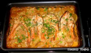 • Запекают сырую или предварительно обжаренную рыбу. При запекании рыбы в духовке посуда должна быть заполнена до краев; иначе влага быстро испарится, и блюдо будет невкусным.