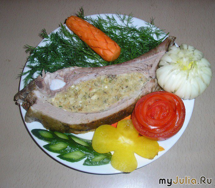Мясо готово. Приступаю к самой ответственной операции – делаю на ребрах «карман». Острым тонким ножом аккуратно подрезаю мясо ближе к ребрам в виде буквы «U». Здесь главное – не спешить, чтобы случайно не проткнуть!