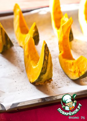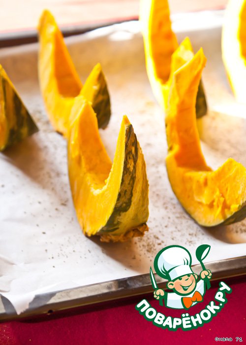 Оставляю тесто немного расстояться, нарезаю тыкву кусочками, кладу на застеленный пергаментом противень. И вдруг кусочек неба прояснивается и выглядывает солнышко, оно будто подмигивает мне и одобряет мои действия…