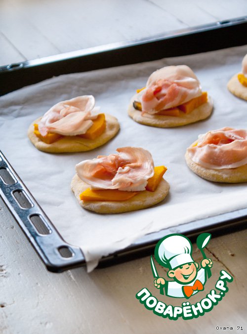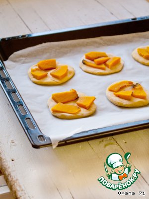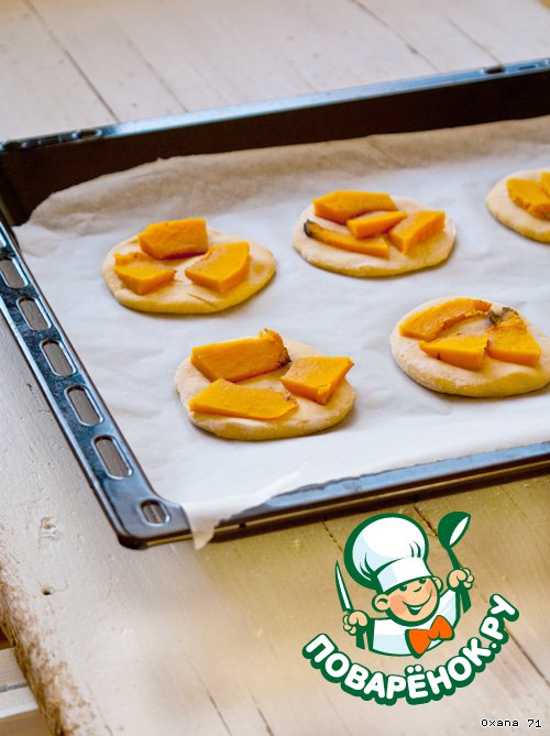 Лепешки выкладываем на противень, застеленный бумагой для выпекания, кладем кусочки запеченной тыквы