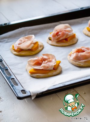Сверху рикотту и кусочки ветчины и отправляем в духовку на 12-15 минут