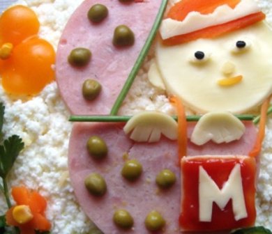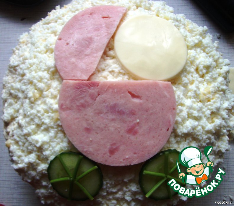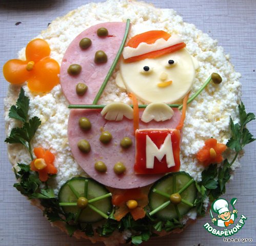 Для украшения мне понадобились: ветчина, сыр Хохланд, 1 вареная морковь, петрушка, огурец, зеленый горошек, немного кетчупа, 1 маслина для зрачков (можно вместо нее использовать черный перец горошком), кусочек болгарского перца.