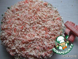 8. Следующий слой – измельченные крабовые палочки и снова соус.