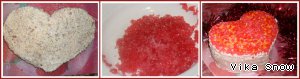 11. Сверху и сбоку торт присыпаем слегка тёртым шоколадом, такое украшение придаст ему зимний сказочный вид. Сверху усердствовать с шоколадом не стоит, иначе он скроет самое главное – красное кремово-мармеладное сердце со снежинками.