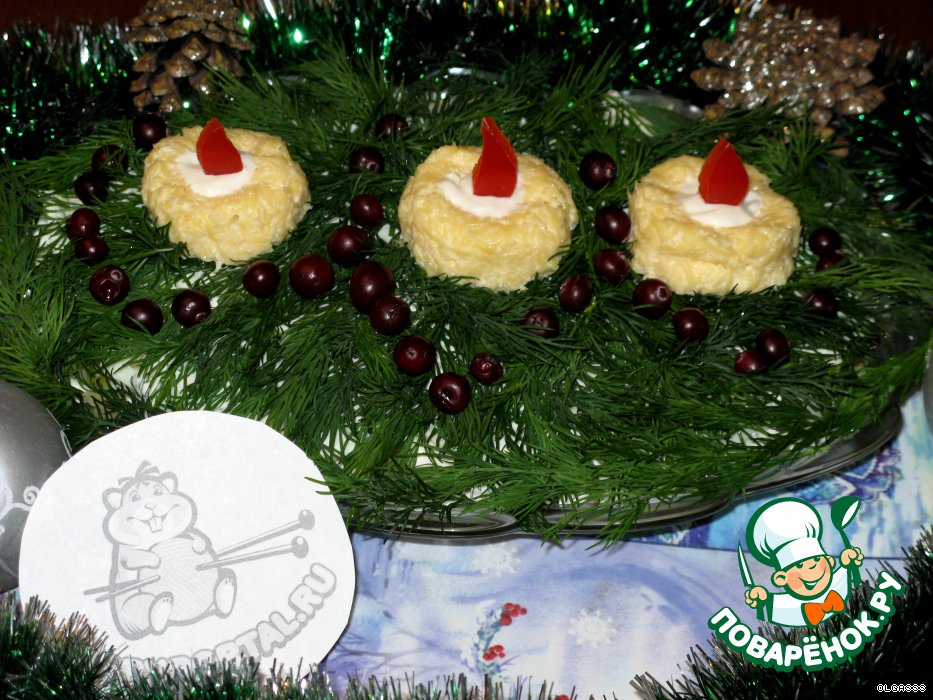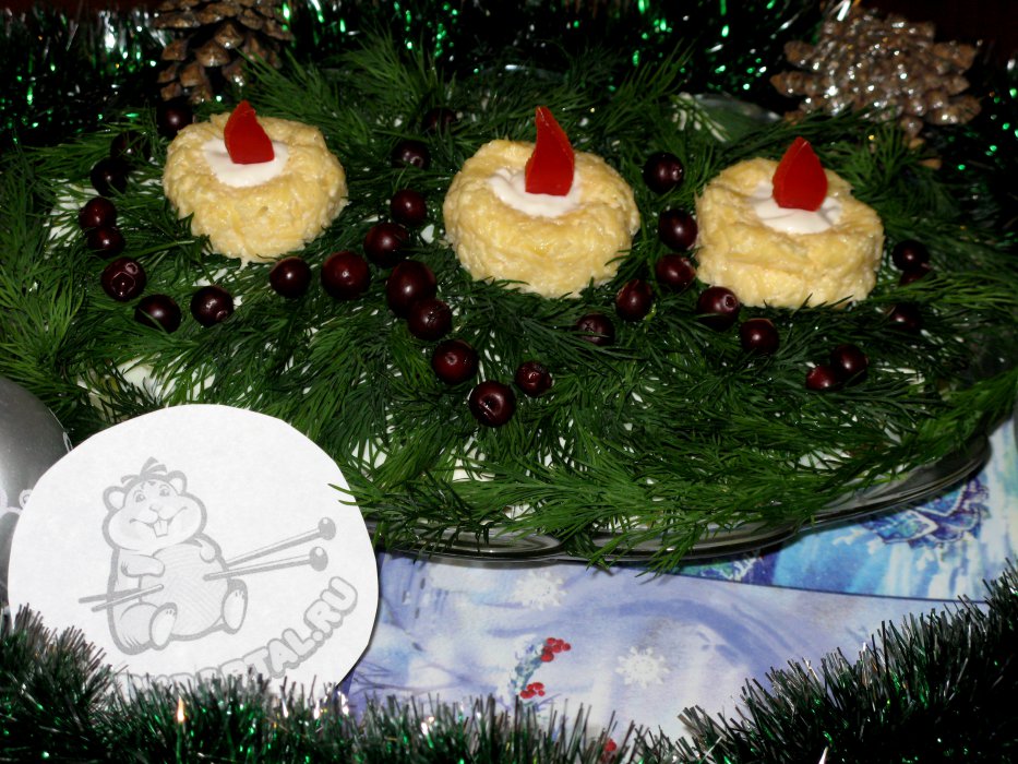Салат накрываем веточками укропа и ставим наши свечечки.