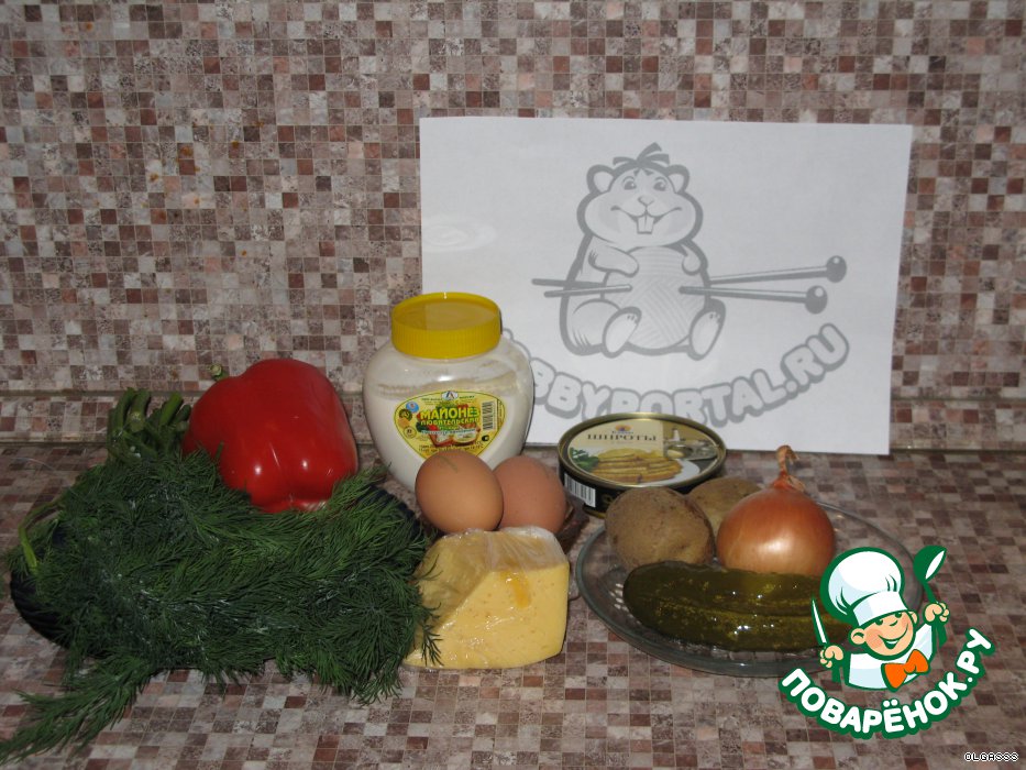 отварная картошка, баночка шпрот, яйца, один маринованный огурчик, лук, сыр, майонез, зелень укропа и немного красного болгарского перца.