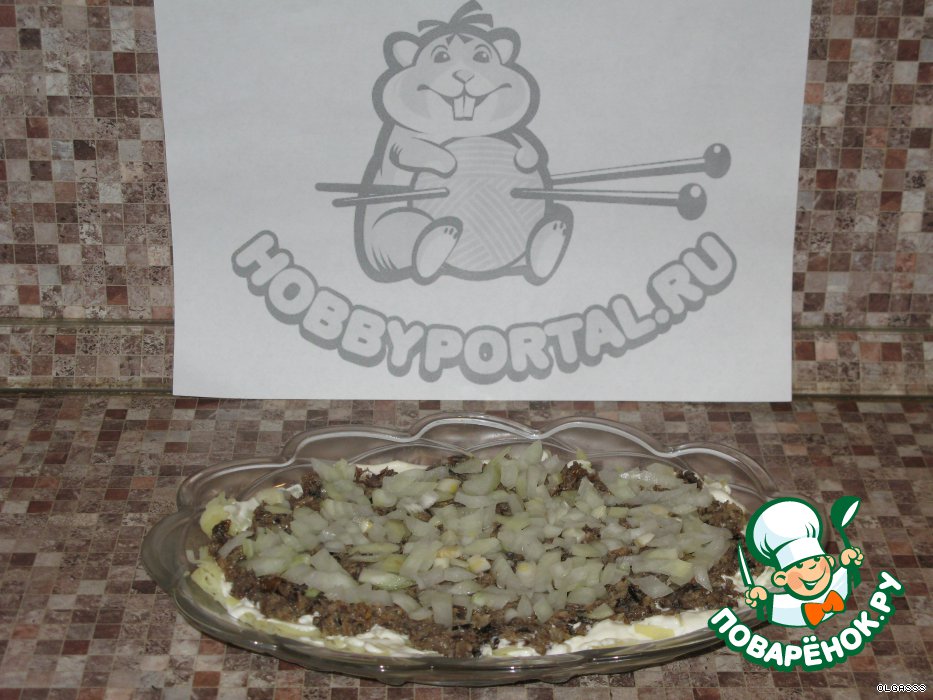 Шпроты размять вилкой и уложить на картошку затем кладём мелко порезанную луковицу