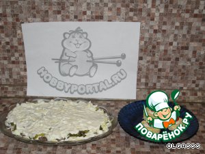 Катошку натереть на тёрке и уложить на блюдо первым слоем, промазать майонезом.