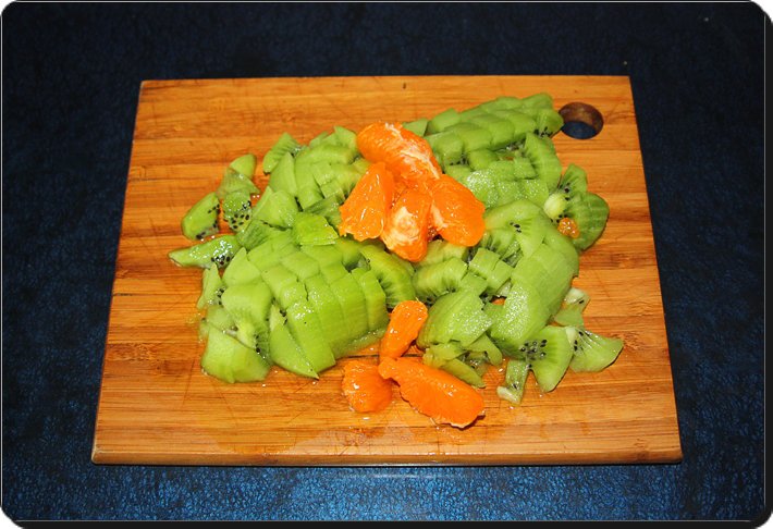 В муке (смеси)делаем небольшую лунку и выливаем молочную смесь, перемешиваем сначала ложкой, потом миксером. На небольшой скорости добавляем муку, после того, как тесто стало однородным, добавляем мелко нарезанные киви. Не старайтесь смешивать слишком сильно: тесто получится слишком "тяжелым".