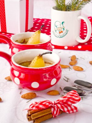 4. Обильно смажьте маслом кокоты. Залейте на половину кремом из миндаля. Уложите (установите) груши по центру кокотов. Готовьте 20 минут в разогретой до 200 градусов духовке.