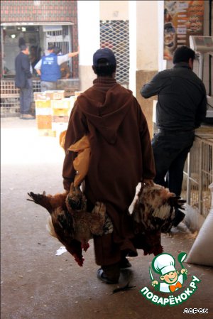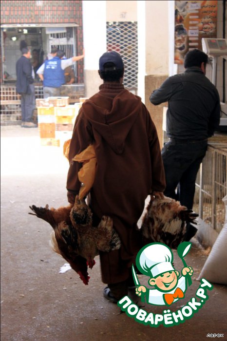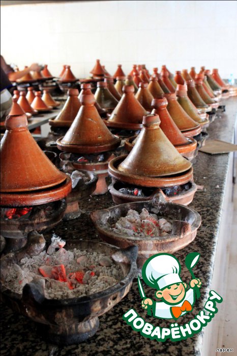 Одно из главных блюд марокканского обеда – конечно, тажин. Блюдо называется так же, как и глиняная посуда (средней емкости сковорода с высокой крышкой), в которой оно готовится. Правильно готовить тажин – на углях. По сути своей тажин – это рагу. Его готовят с говядиной, с бараниной, с верблюжатиной, с курицей, с индейкой, с рыбой. Обычно к мясу, птице или рыбе добавляются овощи, фрукты, приправы и все это медленно тушится в тажине-посуде. Вообще, в Марокко в тажине готовят много чего, эта посуда – основной инструмент марокканской кухни.