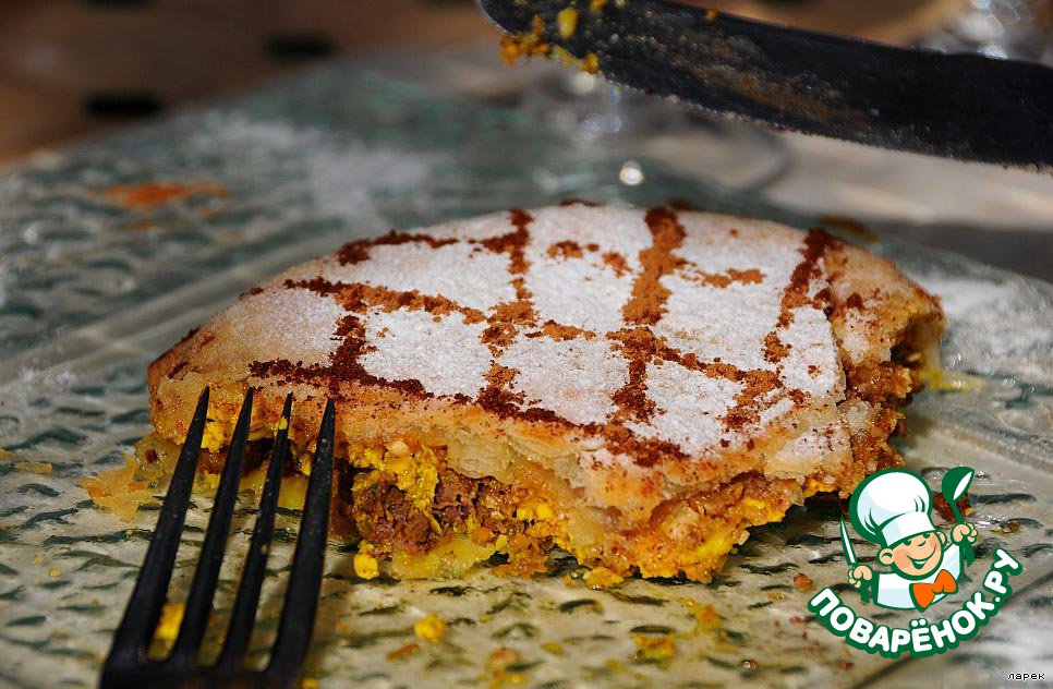 Пастилья (пастилла) – это отдельная история. Это жемчужина марокканской кухни – слоеный пирог (или из теста фило), усыпанный сахарной пудрой и корицей с начинкой из… мелко нарубленной смеси голубиного мяса (можно заменить курицей), петрушки, сваренных вкрутую яиц, миндаля и мёда. Настоящий фейерверк чувств! Подается в начале обеда.