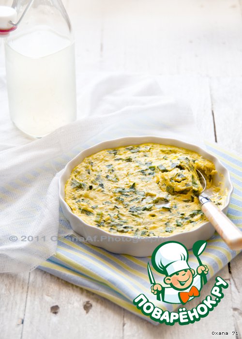 Кефир, рикотту и яйца хорошо размешать венчиком, посолить. Добавить тёртый Пармезан, хорошо размешать. Затем в эту смесь добавить черемшу, размешать и вылить в заранее приготовленные две формочки, смазанные маслом.