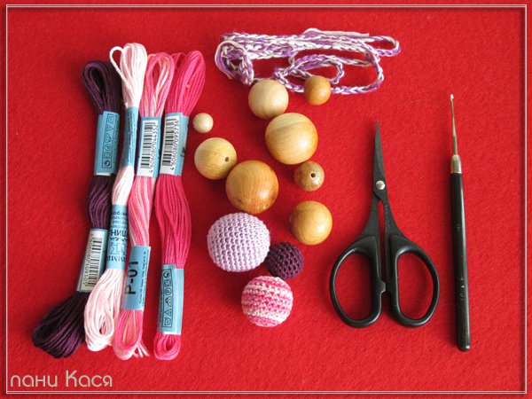 Бусины 25, 20, 14, 10 мм в диаметре, нитки мулине (у меня Гамма, моточки по 8 метров), крючок 1,5 см, ножнички.