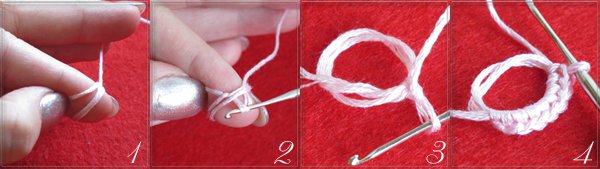 Начинаем обвязку бусины с кольца амиругуми – нитку обернуть вокруг указательного пальца 2 раза, вытянуть петлю, снять и провязать в кольцо 6-7 столбиков без накида. Да, все делается только столбиками без накида, так что для кратности – ст.