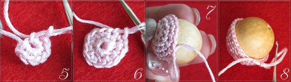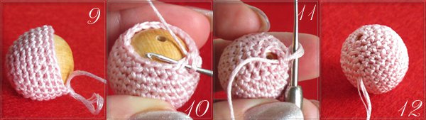 Затянуть кольцо. Получится аккуратная «попка» бусинки. Дальше вяжем 1 ряд – 1 воздушная петля подъема, по 2 столбика без накида в каждую петлю начального ряда, как закончили рядок – уходим на спираль, то есть просто продолжаем вязать, не делая петель подъема. Это даст нам ровную бусину без шва.(шаг 6). Прибавки в классическом описании делаются так – 2 ряд – 1 ст. в петлю – 2 ст в петлю, 3 ряд – 1 ст.-1 ст – 2 ст (то есть прибавки через 1, потом через 2, потом через 3) НО на деле я вяжу, постоянно меряя на бусину. Ибо нитки разные, крючки разные, бусины и руки тоже. Так что 4 степени свободы не предполагают следования четкой логике . Прибавки делаю то через 2, то через 3, постоянно примеряя, пока не довяжу до 1/3 высоты бусины (рис 8 ). Дальше вяжу прямо среднюю треть (рис 9). А потом убавки. Тут уже бусину НЕ вынимаем, вяжем прямо по ней. Видим, что полотно стало свободновато – делаем убавку (пропускаем петлю, вяжем в следующую, не стоит провязывать 2 вместе, получится некрасивая шишечка). Нужно, чтобы обвязка плотно облегала нашу «модель». То есть опять – 1 ст – 1 ст – пропуск – 1 ст – пропуск… В произвольном порядке (рис 10). Довязали до рис. 11. Закрепляем нить, обрезаем и прячем хвостик под вязку (рис 12.). Вот так вяжем нужное количество бусин.