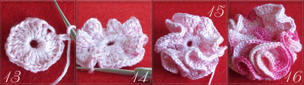 Это просто. Вяжем 6 воздушных петель, замыкаем в кольцо, провязываем в него 24 столбика с накидом (рис 13). 2 ряд – по 3 столбика в каждую петлю (рис 14). 3 ряд – еще раз по 3 столбика с накидом (рис 15). И 4 рядок – еще раз по 3 столбика (рис 16). Ушло на это 4 раза по 8 метров ниток…