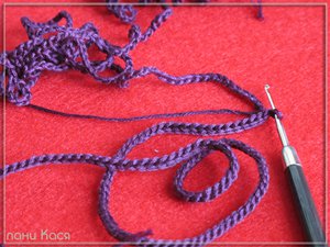 Из 8 метров вяжем цепочку воздушных петель. И 2 мотком обвязываем эту цепочку полустолбиками. Получаем плотненький шнур. Да, длинный. Не волнуйтесь, он станет сильно короче за счет узлов на нем. НО если вам надо короче – не вопрос, и подраспустить можно будет.