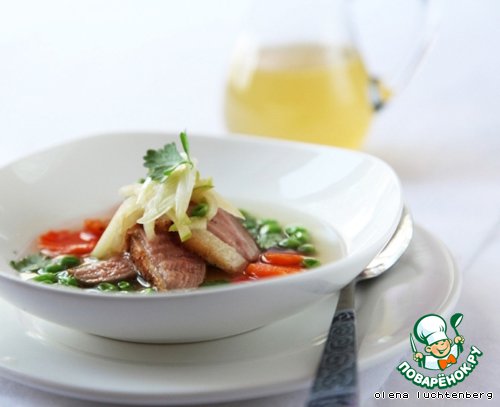 В подогретую тарелку выложить овощи, в центр нарезанную пластинками утиную грудку. Бульон сервировать в кувшине. В тарелку бульон добавляется уже за столом.