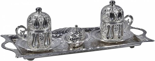 Некоторые части сервиза делали из дерева и украшали резными узорами – например, чаша для охлаждения или коробка, в которой хранились кофейные зерна. Особой популярностью пользуются кофемолки, украшенные вышивкой, росписью и деревянными аппликациями. Такие кофемолки производятся в основном в Стамбуле и Бурсе.