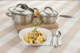 В коллекции Balance из нержавеющей стали представлены: ковш с крышкой диаметром 16 см и кастрюли диаметром 18 см, 20 см, 24 см.