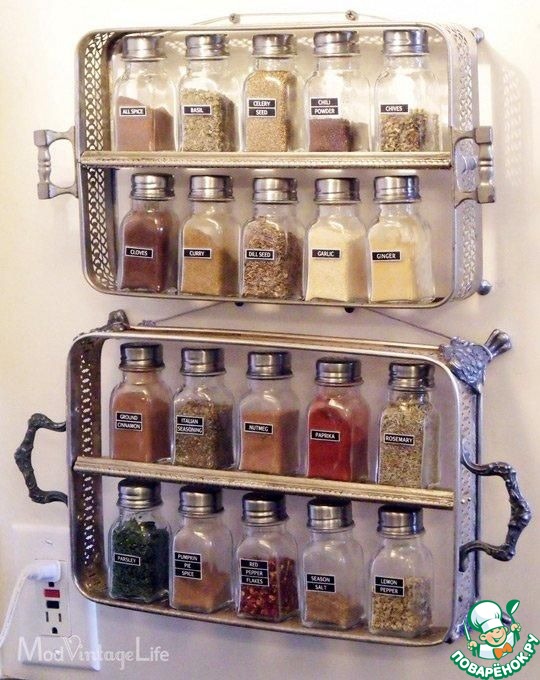 Многие хозяйки любят украшать свою кухню прозрачными баночками для специй. Это удобно — видно, где что лежит. Это красиво — разноцветные пряности в красивых контейнерах выглядят красиво. Но на свету большинство приправ очень быстро теряют свои ценные свойства. Место для хранения специй — в темноте. Для этой цели подходят наборы из керамики с плотно пригнанными крышками. Удобно выбирать с надписями или картинками, которые подскажут, где что лежит. Можно просто разместить их в шкафу на специальной полке или в ящике (в этом случае подходит и стеклянная посуда).