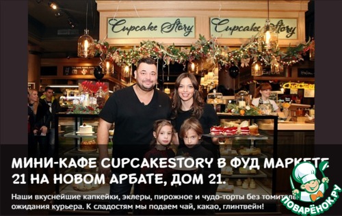 Не так давно состоялось открытие мини-кафе Cupcake Story в Москве на Новом Арбате, 21 – найти его можно в Фуд Маркете 21. Двери этого уютного заведения открыты для посетителей ежедневно с 12:00 до 24:00. Здесь всегда можно заказать доставку полюбившихся сладостей на дом, а можно насладиться их великолепным вкусом прямо за столиком мини-кафе. Вкуснейшие торты, пирожные, эклеры и капкейки никого не оставят равнодушными! Что касается напитков, то в Cupcake Story всегда можно заказать чашечку чая, а также чудесное какао или глинтвейн. А еще здесь подают к столу варенье и мед!