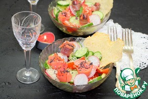 И еще одно очень удачное решение – овощной салат с форелью и сырными чипсами.
