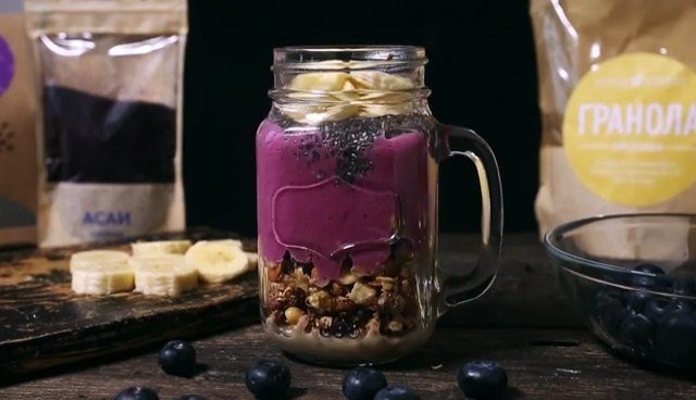5. В высокий стакан выкладываем слоями - гранолу, асаи-боул, семена чиа, банан. Сверху украшаем голубикой.