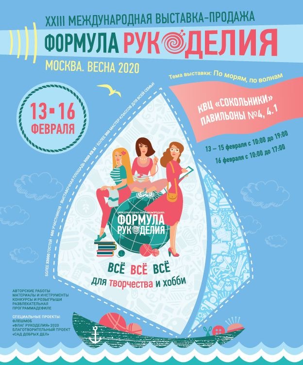 Тема весенней выставки – «По морям, по волнам». Дух странствий, веселые морские мотивы, воплощенные в разных видах рукоделия, необычные фотозоны. 15 февраля в 14-00 мы подведем итоги большого вышивального флешмоба «Флаг Рукоделия 2020», также посвященного морю, и узнаем, кто же из вышивальщиц выиграл путешествие в Дубай от нашего партнера Victor’s Company!