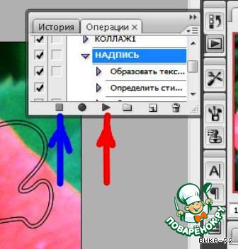 6. Возвращаюсь к панели Операции - нажимаю кнопку Останавливает воспроизведение/запись (синяя стрелка). Экшен создан. Теперь, чтобы воспроизвести надпись на другой фотке достаточно в панели Операции отметить нужный экшен и нажать кнопку Выполняет активную операцию или команду(красная стрелка).