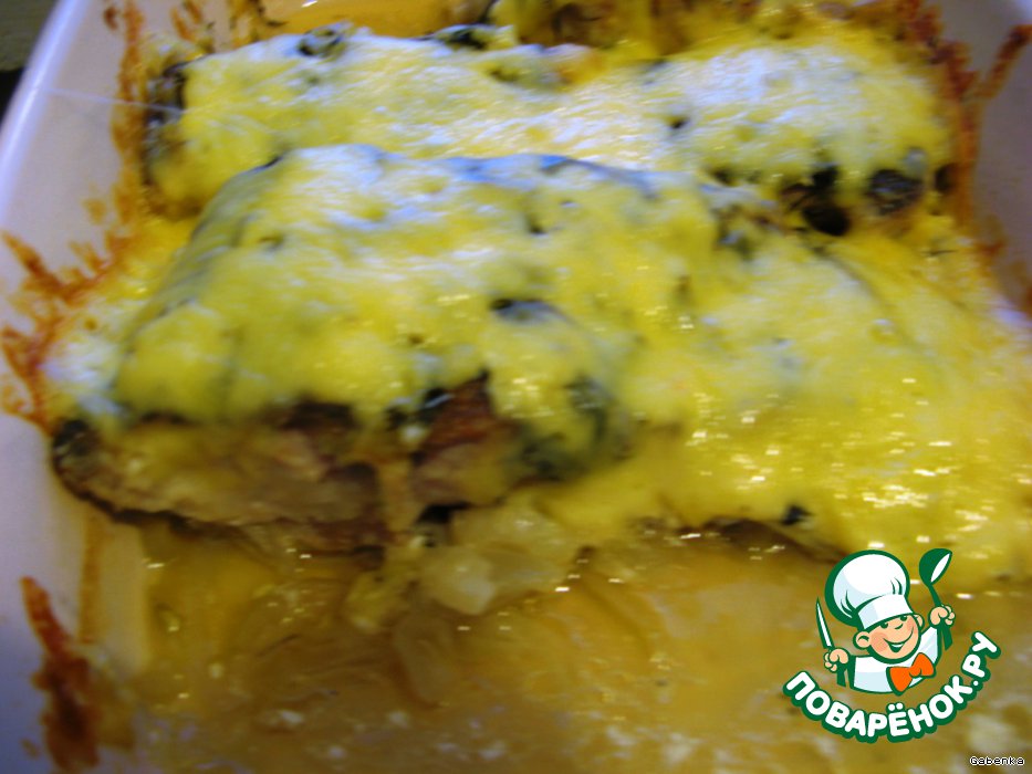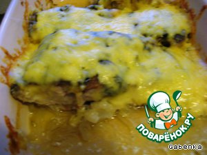 2. Лук (2-3 большие луковицы)порезать на кольца или полукольца, спассеровать в постном масле и выложить в форму для запекания (утятницу и т.д), главное, чтобы можно было поставить в духовой шкаф.