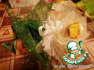 8. Когда все конфеты готовы, складываем из наших конфет-цветов букет и скрепляем его тейп лентой.