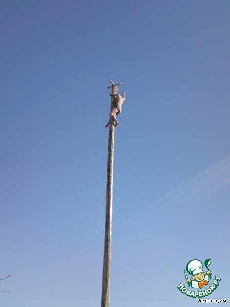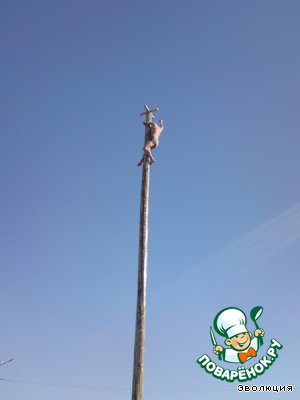 Молодец-удалец добрался до верха, за что ему был немедленно вручен шикарный красно-коричневый петух.