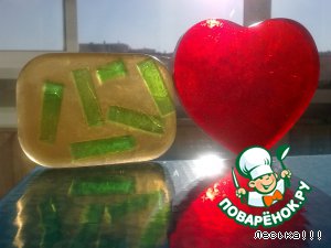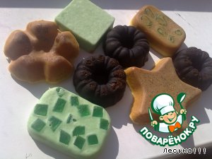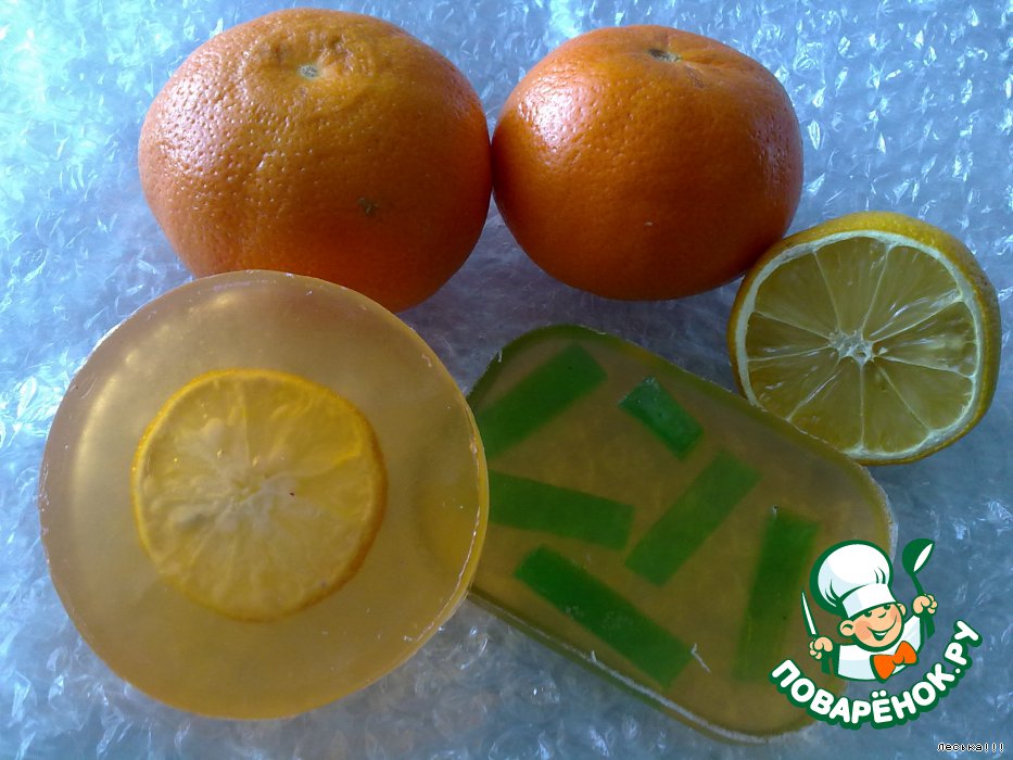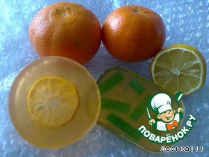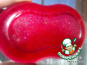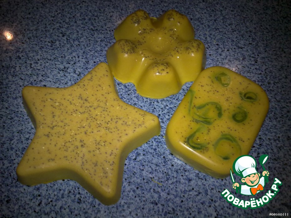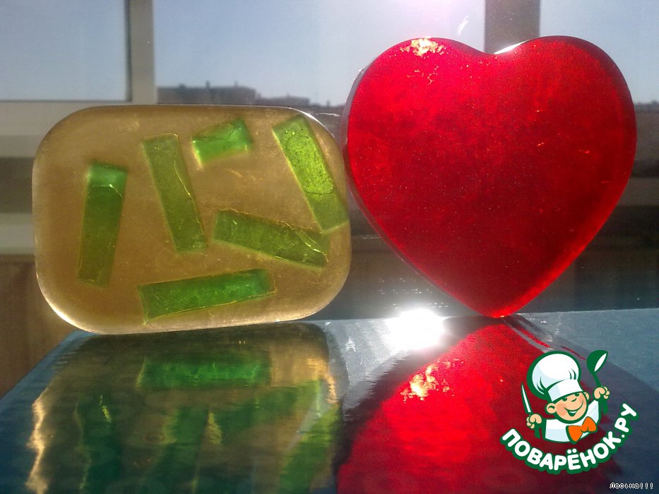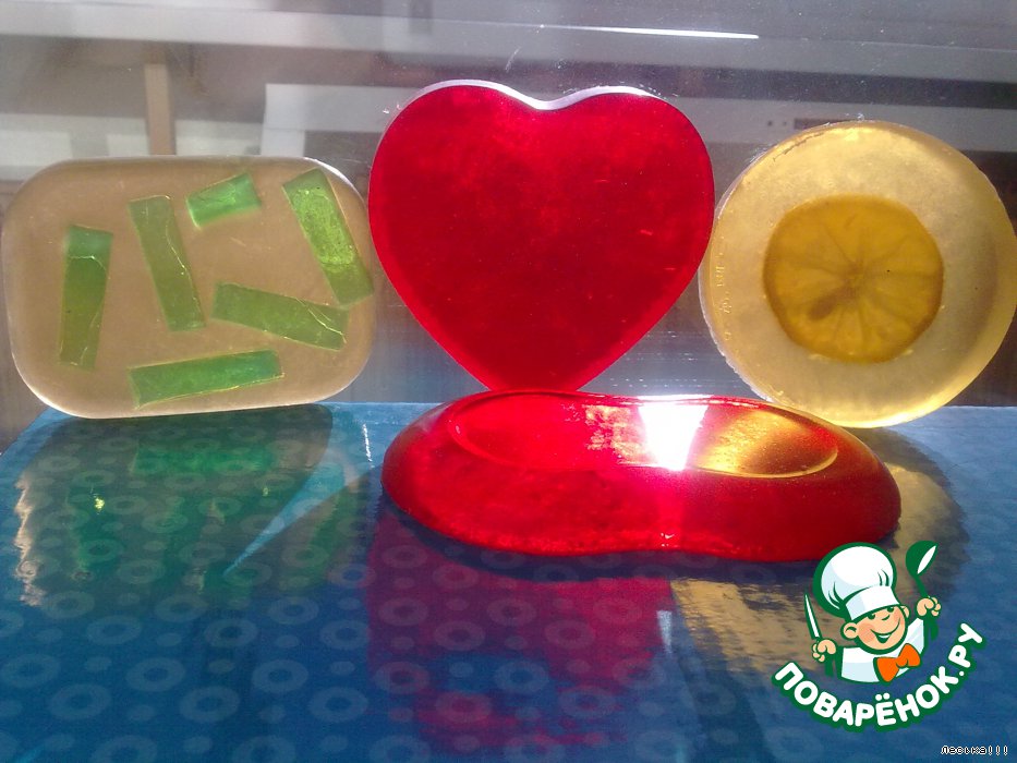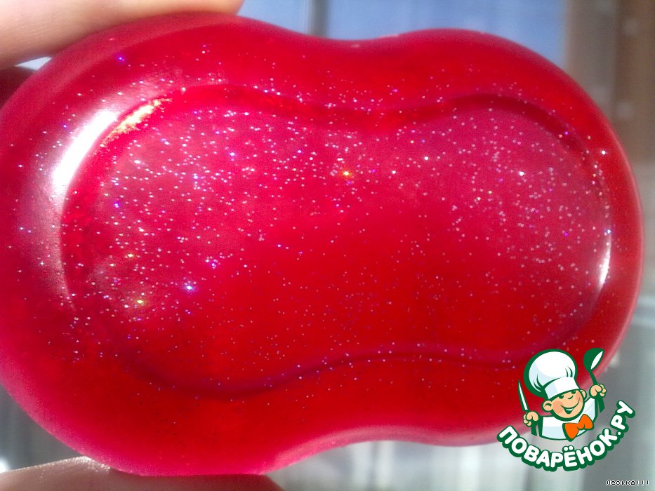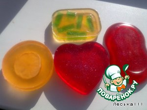 Желтое - с долькой лимона, ЭМ лимона, миндальное масло. Красное с ЭМ розы и блестками