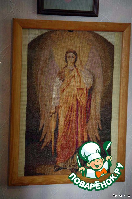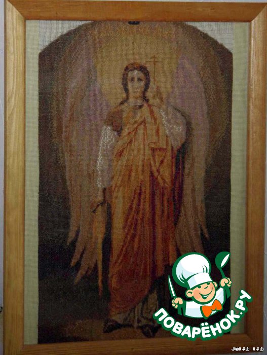 В середине работы икона была освящена в Храме "Рождества", в Вифлиеме. Так уж получилось, что в середине, но сам Архангел на тот момент уже был вышит.