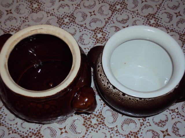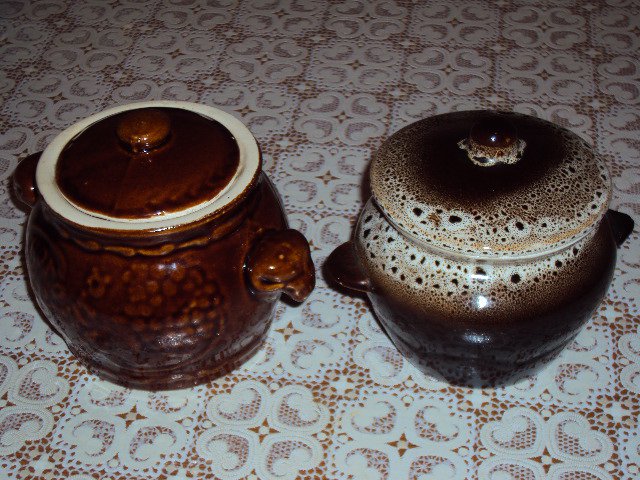 Рассмотрим два разных горшочка для жаркого, вот они. [cut] Слева - побольше размером, он более вместительный, по качеству, скажем второй сорт.