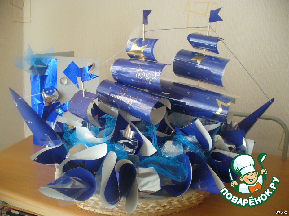 Маши Eva Grimm, на её очаровательные букеты и подарки из конфет. Вот, решила поэкспериментировать, нашла в интернете мастер-класс + подвернулся повод (у нашего друга сегодня ДР). Вот, соорудила вчера такой кораблик. Конечно, он еще очень далек от идеала - всё-таки это первый у меня опыт изготовления таких подарков + материалы пришлось покупать за один день, поэтому бумага синяя у меня не такая, которая должна была быть (не должна она быть белой с изнанки), просто не удалось найти сразу.