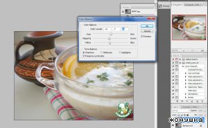 2. Далее идем в Image (Изображение) – Adjustments (Корректировки)- Color balance (цветовой баланс) ставим точку в положение Midtones (Средние тона) и в зависимости от того какие оттенки преобладают, двигаем ползунки убирая желтизну или красный оттенок. Не нажимая ок ставим точку в положение Highlights (света) и тоже управляем ползунками потом переходим в положение Shadows ( тени) и тоже двигаем ползунки, добавляйте по немногу и так пока результат нас не удовлетворит и нажимаем ок.
